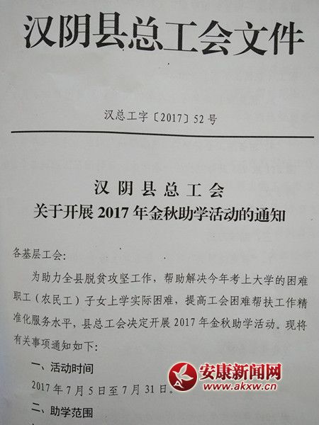 安康新闻网讯(通讯员 储毅)为助力全县脱贫攻坚工作,帮助解决今年考上大学的困难职工(农民工)子女上学实际困难,提高工会困难帮扶工作精准化服务水平。日前,汉阴县总工会印发了《关于开展2017年金秋助学活动的通知》。