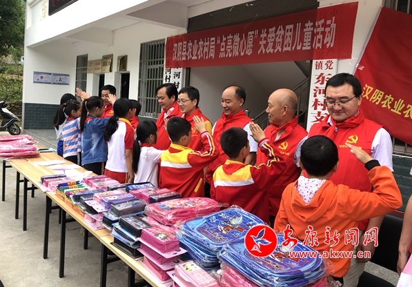 本网讯 (通讯员 张莉)一个崭新的书包、一个心仪已久的文具盒、一盒书写未来的铅笔……每个孩子都应被宠爱,每个梦想都值得去灌溉。为了让贫困留守儿童也享有同样美好的节日,六一儿童节一大早,汉阴县农业农村局领导干部前往帮扶联系村漩涡镇东河村,举行“点亮微心愿、关爱贫困儿童”公益行活动,用实际行动为贫困留守儿童送去爱心,送去欢乐,给他们更多的“精细关爱”,让梦想、信心与爱重回孩子们的心中。