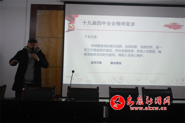 宣讲从十九届四中全会的基本情况、重大意义,《决定》提出的总体要求、总体目标、重点任务,《决定》十三方面的制度安排及教育人该怎么做几方面深入讲解了十九届四中全会的具体内容、中国特色社会主义制度和国家治理体系的显著优势。宣讲内容全面、体系完整、阐述深刻。在宣讲中,主讲人积极与教师现场交流,既引用身边案例,又加入自身体会和感悟,精准阐释了十九届四中全会的精神实质和丰富内涵。