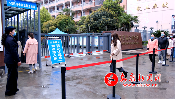 校门口是学生入校的第一关。演练现场,设置有5G热成像检测通道,安保人员组织“学生”有序排队,“学生”们按要求保持间隔1米以上,接受身份核验后依次从检测通道的消毒垫上踏过。通道卡口测温组的老师检测“学生”体温,体温正常“学生”,顺利进入校园。