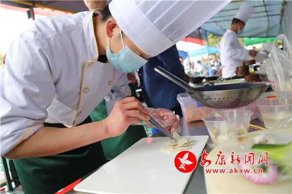比赛现场,一个个灶台热火朝天,参赛选手或精雕细琢,或挥铲舞勺,按照色、香、味、形四项标准,充分发挥自己的精湛厨艺,热油、翻炒、调味,现场菜香扑鼻,美食盛宴让人垂涎欲滴,观赛人员看得津津有味。评审组人员现场专业的品尝、打分。