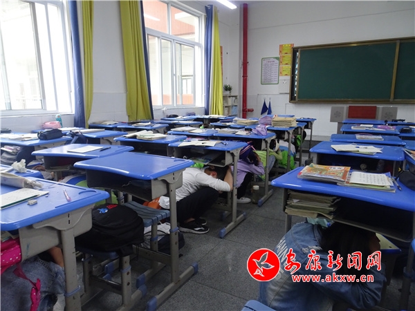 当广播发出“三长一短”地震警报信号时,上课教师立即停止授课,转而成为教室演练负责人,指挥学生抱头躲在课桌下,蜷曲身体降低重心,并尽可能用书包保护头部。一分钟后,广播发出紧急疏散信号。老师告知学生撤离教室,进入紧急疏散演练环节。每班靠前后门的两位学生立即把门打开,教师迅速将全班学生分成两路纵队,指挥其按照预定的疏散路线有序撤离。楼道管理人员和跟班教师马上到达指定岗位,协助学生撤离疏散到操场安全地方。所有师生在操场集合完毕,各班清点人数向总指挥汇报,学校负责人进行活动总结。