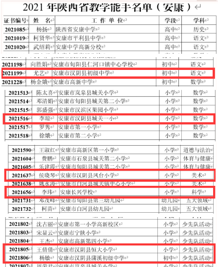 本网讯(通讯员 林爱铭)日前,从《陕西省教育厅 陕西省人力资源和社会保障厅关于授予樊琼等816名教师陕西省教学能手称号的决定》中获悉,汉阴县尤艺、李琼、侯晓琴、李玮、王倩倩、杨敏6位教师榜上有名,获评“陕西省教学能手”称号。