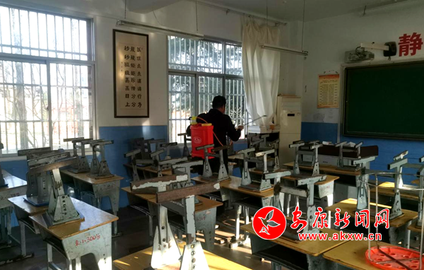 王怀军为学生活动场所消毒 刘彩霞 摄