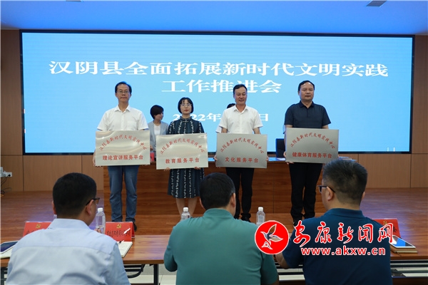 会上,涧池镇、文旅广电局、城关镇三元村、南街社区负责人分别作交流发言,祖白云宣读了《关于成立汉阴县新时代文明实践中心和新时代文明实践志愿服务总队的通知》,刘飞霞为县新时代文明实践中心志愿服务队授旗,刘飞霞、祖白云、周星共同为理论宣讲服务平台、教育服务平台、文化服务平台、健康体育服务平台授牌,周星就进一步推动全县新时代文明实践工作做了周密安排部署。