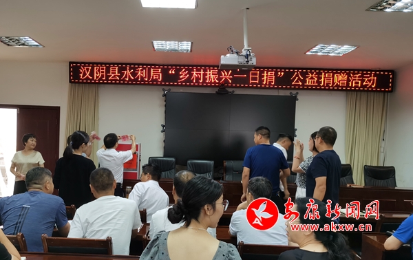 本网讯(通讯员 储毅 )7月18日上午,汉阴县水利局在机关会议室,组织水利系统干部职工开展“乡村振兴一日捐”活动,助力乡村振兴。dXA安康新闻网