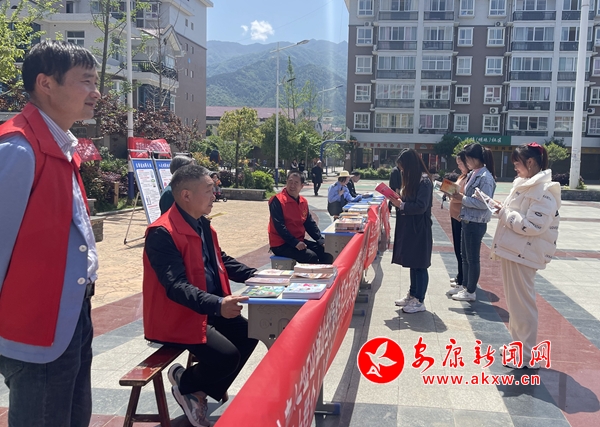 舞台两侧整齐规范地摆放着咨询台和展板,志愿者们正在开展医疗健康、法律、环保、安全等知识宣传,并发放了纸杯、毛巾、洗脸盆等群众需要的日常生活用品。