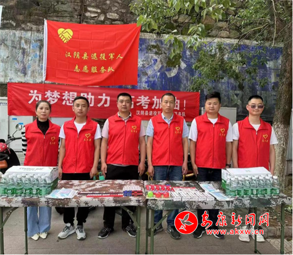 本网讯(通讯员 钱德宝) 一年一度情系万家的高考在6月7日拉开了帷幕,汉阴县退役军人事务局组织30余名退役军人志愿者开展高考献爱心活动,在考点附近设置了方便学生和家长的服务点,准备了充足的学习用品、水、祛暑降温物品;协助维持现场交通秩序,为广大考生及家长提供出行便捷,志愿为高考学子护航,爱心送考。