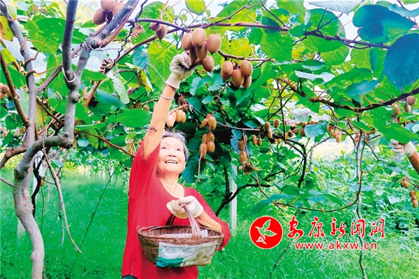 在观音河镇义兴村的猕猴桃种植基地,只见一根根藤蔓上挂满了圆润饱满、香甜多汁的猕猴桃,阳光透过片片绿叶,照在枝头成串的果实上,沁人心脾的猕猴桃果香便四溢开来。果农们正行走在藤架间采摘猕猴桃,脸上洋溢着丰收的喜悦。
