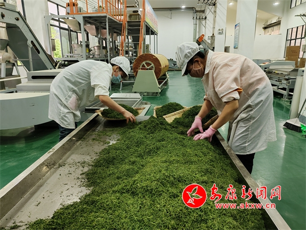在漩涡区域加工厂的制茶生产车间内,鲜嫩的茶叶经过杀青、揉捻、干燥、提香等程序,醇香的茶便新鲜出炉。“今年在开采之前,镇政府面向茶叶产业合作社负责人和技术骨干组织了一次统一的培训,对采摘手法,采摘标准进行了统一的指导培训,便于我们后面的生产和后期产品的把控。”茶厂负责人冯卫平说。