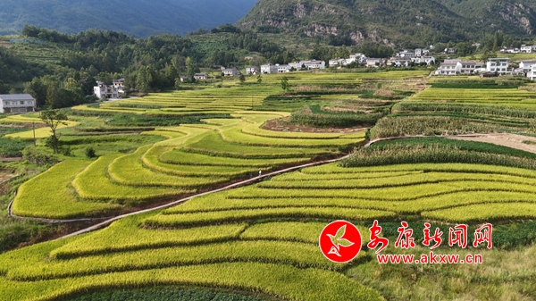 凤堰梯田的1.2万亩连片水稻迎来了丰收季,蜿蜒盘旋的金黄色线条从山脚盘绕至山腰,层层叠叠的稻田与整洁的村庄、蜿蜒的道路、远方的青山相映成趣,美不胜收。农户们也抢抓晴好天气,确保颗粒归仓,勤劳的乡亲们穿梭在稻田中,构成了一幅祥和而广阔的秦巴山区农耕文明美丽画卷。