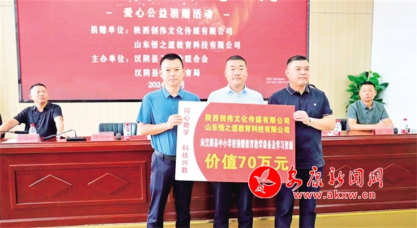 活动中,陕西创伟文化传媒有限公司与山东悟之道教育科技有限公司联合向汉阴县26所中小学捐赠了教学无人机、电钢琴、教师护颈按摩枕等价值70万元的教育教学设备和学习资源,助力当地教育事业发展。XyS安康新闻网