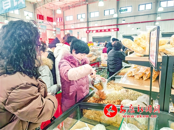 “这里的年货品类齐全、物美价廉,我选了一些干果和调味料,听说这里的猪肉都是农家喂养的,看起来很新鲜,一会儿还要买一些回去尝一尝。”赶集的刘女士一边开心地展示着自己选购的商品,一边和导购交流。