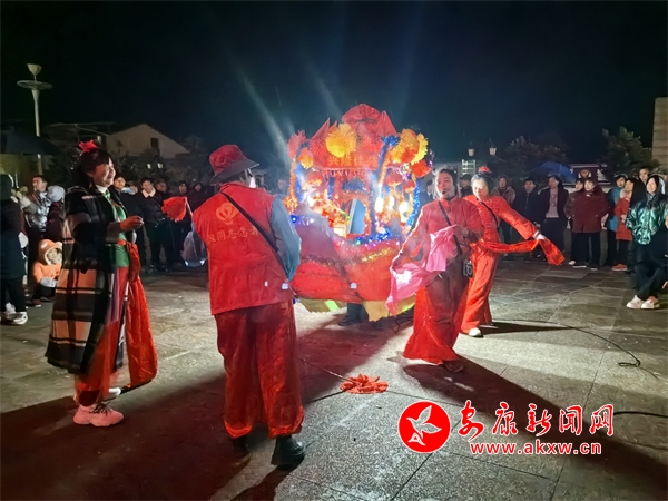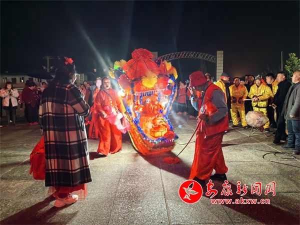在位于汉阴县平梁镇的兴隆佳苑社区,春节期间,小区里处处洋溢着节日氛围。夜幕降临,社区广场响起阵阵锣鼓声,耍花船表演正式开始。只见表演者双手提船、配合默契,船体随着“波浪”旋转、颠簸,身穿喜庆艳丽的服装、头戴五彩头饰的表演人员个个精神抖擞,一边前行,一边唱着汉阴本地的花鼓戏,祈求来年风调雨顺、福寿安康。翻飞的彩扇、华丽的彩船,精心编排、诙谐幽默的表演,为社区群众呈现了一场精彩的视觉盛宴。