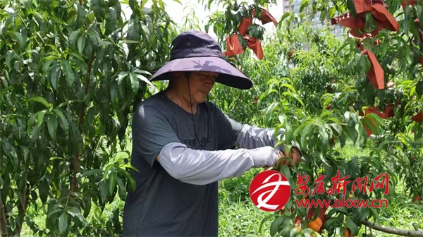 同样迎来收获的还有城关镇的黄桃,在城关镇龙岭村的黄桃种植基地,连片的桃树郁郁葱葱,金灿灿的黄桃压弯了枝条,空气中弥漫着诱人的桃香。基地负责人刘宏正忙着采摘,脸上洋溢着灿烂的笑容,他一边采摘一边介绍道:“我们这个桃园有金凤黄桃、黄金黄桃、秋彤桃和冬桃四个品种,一共有9亩多,从6月中旬到10月左右,陆续都有成熟的桃子。”