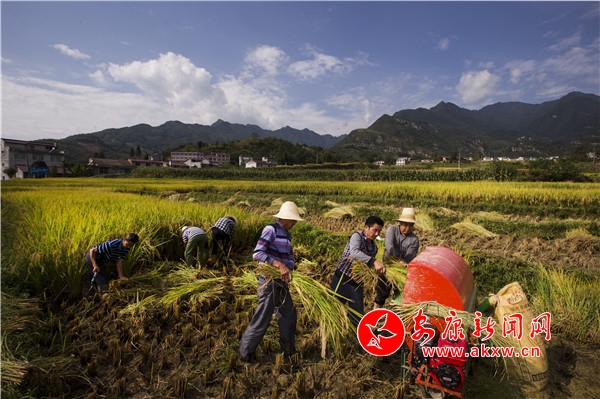 图说|汉阴县漩涡 千亩水稻开镰收割