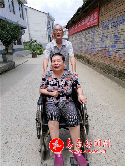 只要遇到好天气,张业印就会用轮椅推着妻子到村部畅亮的大院巴上晒太阳,或一起到社区里邻里之间串个门,一起聊家常;有时还会推着轮椅远到陕南民俗村第一村的鲁家大院转一转,让妻子始终保持着愉悦的好心情。