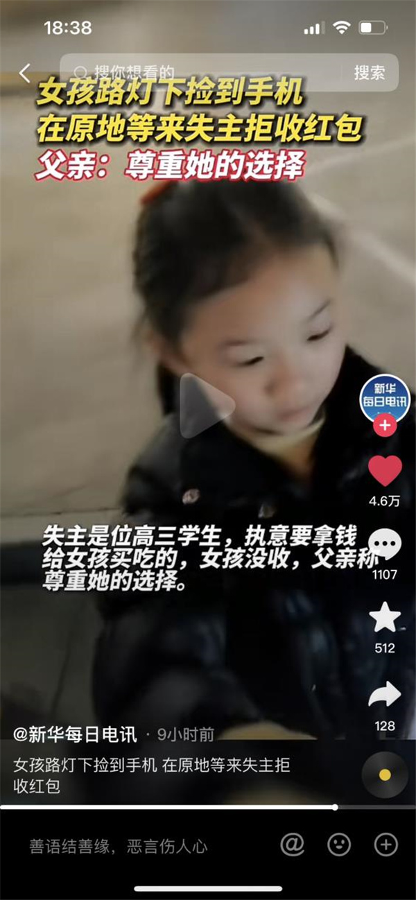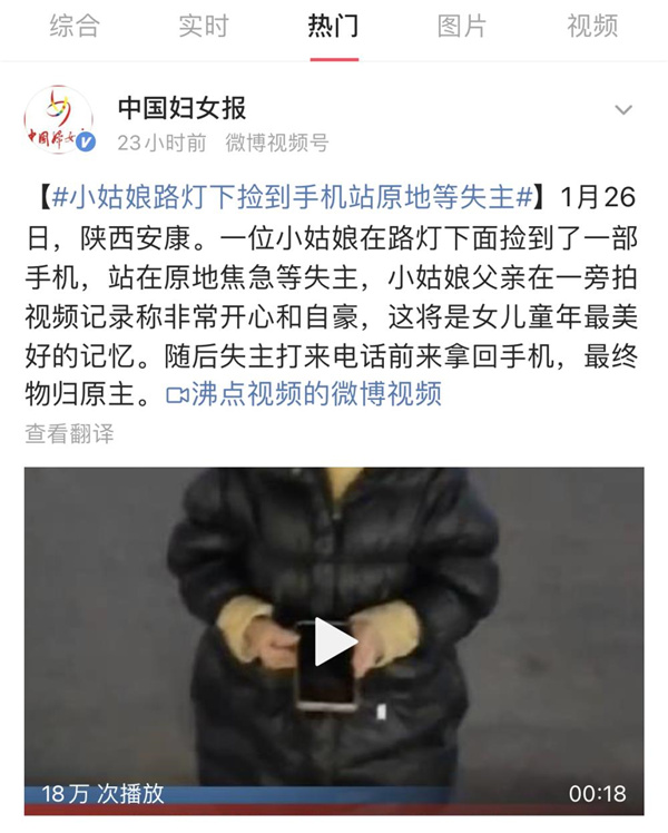 1月28日下午,#女孩捡手机站原地等失主##小姑娘路灯下捡到手机站原地等失主#话题冲上了抖音热门、微博热门,广大网友纷纷点赞。