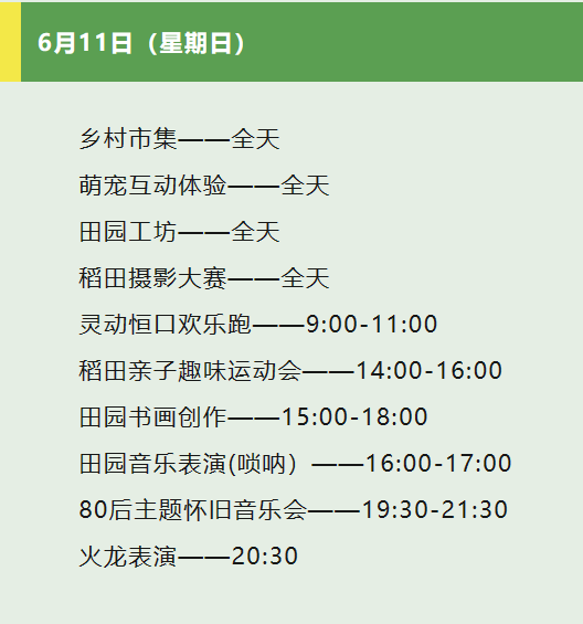 当日,现场还举办了稻田拔河、稻田摸鱼、稻田摔跤等娱乐活动和田园古筝表演、70后主题怀旧音乐会、火龙表演等演出活动,吸引众多游客朋友前来打卡。6月11日,灵动恒口欢乐跑、亲子趣味运动会、唢呐音乐表演、80后主题怀音乐会等活动精彩继续......