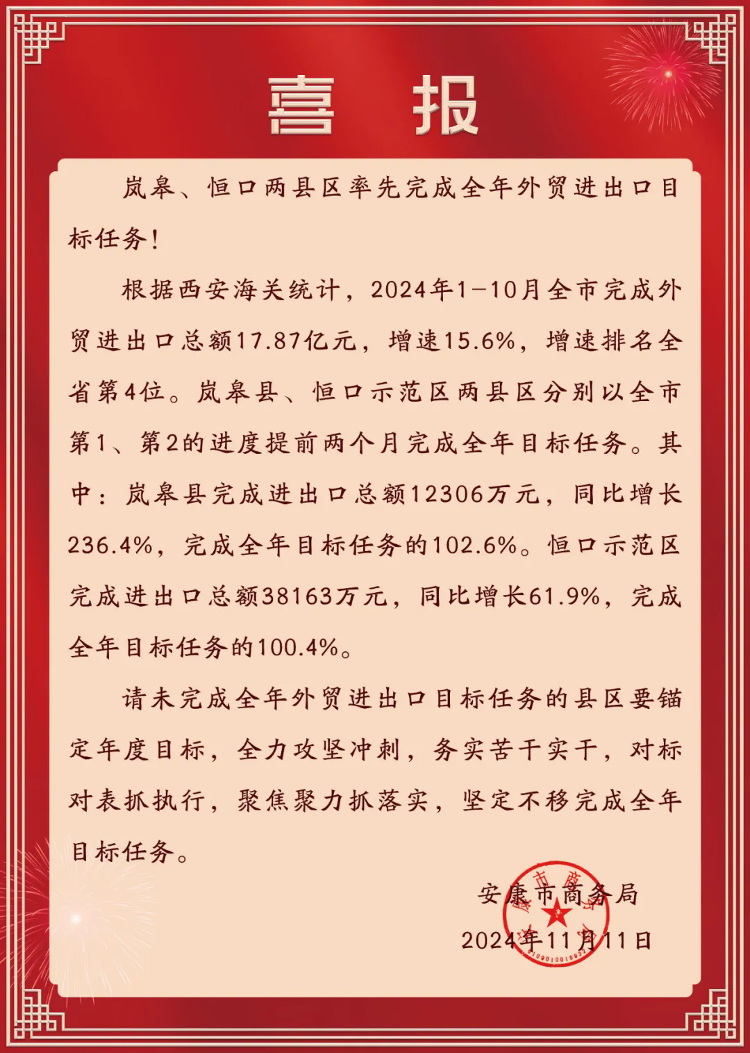 近日,市商务局发来喜报,恒口示范区率先完成全年外贸进出口目标任务。
