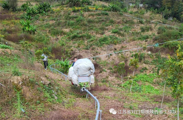 2022年,常州市新北区对口帮扶岚皋县联络组专门拨付苏陕协作资金350万元,为当地发展猕猴桃、碧根果等产业的村子安装山地轨道运输车20公里,直接让3500亩土地的种植户受益。轨道运输车的安装,让当地群众从此告别了依靠人力肩挑背扛的历史。包括猕猴桃、黄豆、红薯等在内的所有庄稼,从此在地里收获后,只需要主人装入轨道运输车,就可以直接送到农用车上,然后拉回家。