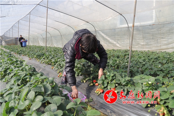 12月29日,恰逢周日,天气晴好。笔者在岚皋县城关镇茅坪村众达现代农业园区看到园区停满了车辆,草莓日光大棚里暖意融融,浓绿的草莓枝叶间,长出一颗颗鲜艳的草莓,草莓的香味扑鼻,格外诱人。不少游客带着小孩正在热热闹闹地体验采摘草莓的乐趣。