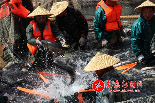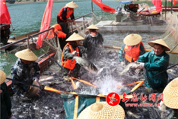 本网讯(通讯员 廖霖 杨敏丽 邱萌 )一条条肥美硕大的花鲢和白鲢欢腾雀跃,在一张张大网的包裹下被捕捞上岸。网中鱼儿蹦蹦跳,岸上渔民弯腰笑,水花四溅,鱼儿欢腾绘制出了一幅“鱼跃人欢渔家乐”的精美画卷。连日来,岚皋县岚宫湖水库生态鱼养殖基地呈现出水清鱼肥,鱼肥民富的动人景象。