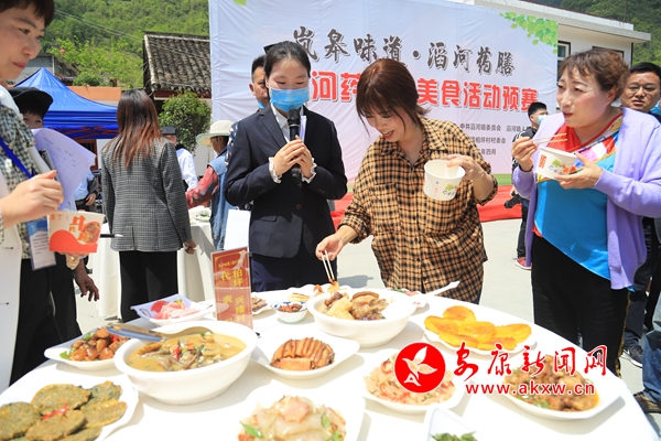 畅游清幽药谷之镇,品尝农家药膳美食。活动现场,人潮涌动,十分热闹。山药烧排骨、槐花鸡蛋、青蒿牛肉饼、香酥芍药花、蛮子药炒鸡蛋……一道道现场烹饪制作的美食,极具本土特色,令人垂涎三尺……让人“食”指大动,引得近千名村民和外地游客“味蕾大开”,争相品尝,舌尖上的乡愁和美景第一次在这个四月深刻交融。