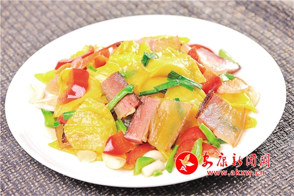蛋皮炒腊肉是土生土长的岚皋菜.烹饪好的蛋皮炒腊肉色香味俱全。如黄金般闪耀的蛋皮、腊肉与如翡翠般碧绿的韭菜、青椒相得益彰,勾引着人的食欲。入口更有丝丝缕缕的浓香和淡辣,自齿喉弥漫而下,久久萦绕回荡于五脏六腑间,让人吃了还想吃,吃了便永生难忘。