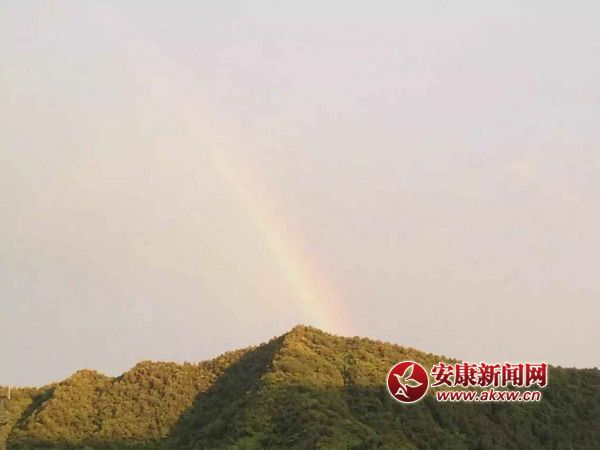 安康新闻网讯 (通讯员 安妮)2015年8月4日傍晚时分,在经历了8月3日暴风雨袭击,陕西省宁陕县的天空中出现美丽彩虹。引来了不少群众的赞叹,忍不住停下脚步拍照留念。雨后,彩虹出来了,整座山城的傍晚被夕阳染成了金色,美不胜收。6WK安康新闻网