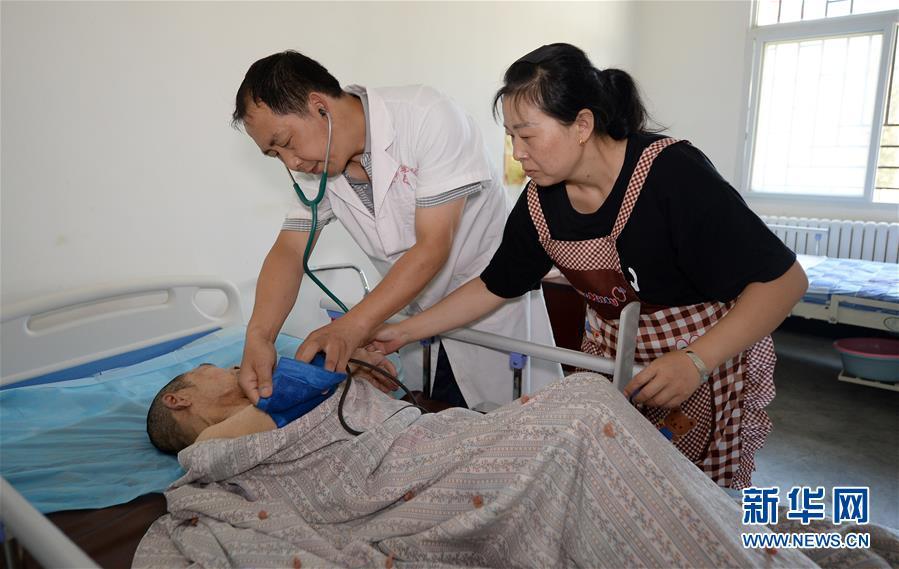 宁陕县中心敬老院五保失能托养中心内,医生钟宝安在为托养老人文贵地诊病(8月20日摄)。钟宝安是宁陕县城关镇老城村村医,平时也负责着敬老院人员的日常医疗。
