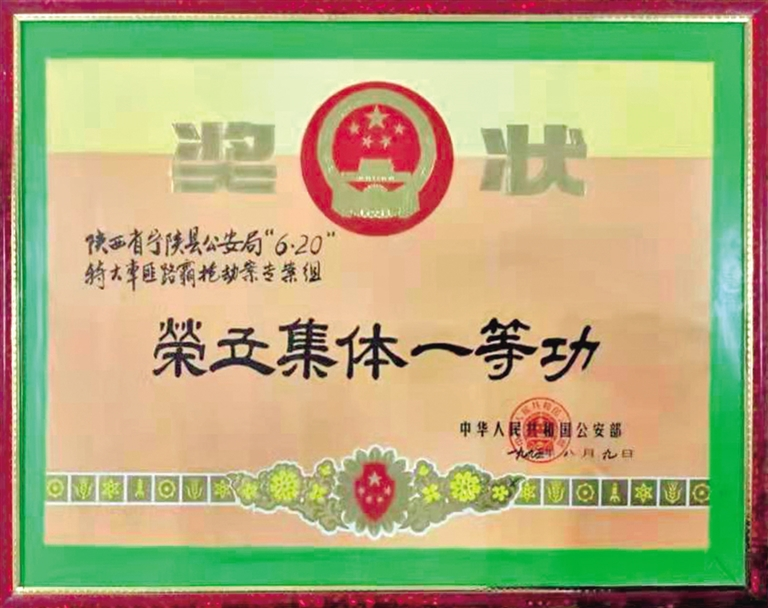 和往常一样,我正和管理档案的陈姨一起整理资料,忽然被眼前一块荣立集体一等功的奖状吸引,仔细查看,发现上面的详细内容是:陕西省宁陕县公安局“6.20”特大车匪路霸抢劫案专案组荣立集体一等功,落款是中华人民共和国公安部,时间是1995年8月9日。