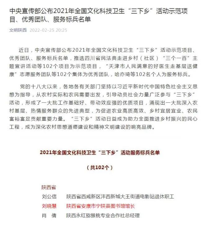 近日,中央宣传部公布2021年全国文化科技卫生“三下乡”活动示范项目、优秀团队、服务标兵名单,推选四川省民法典走进乡村(社区)“三个一百”主题宣讲活动等102个项目为示范项目,“天津市人民满意的好医生走基层送健康”志愿服务团队等102个集体为优秀团队,哈亦琦等102名个人为服务标兵。其中,宁陕县图书馆长刘晓慧获评2021年全国文化科技卫生“三下乡”活动服务标兵。S58安康新闻网