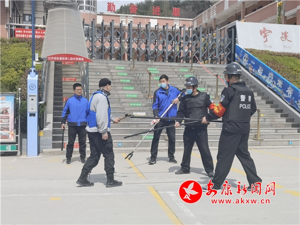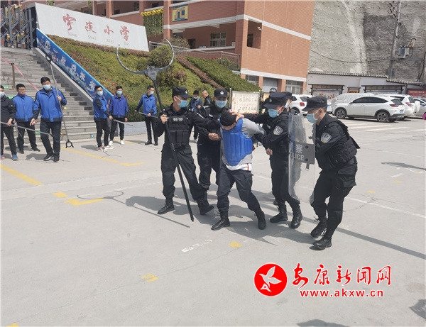 演练开始,下午1点30分,入校音乐响起,两名校警、家长护卫队、值班老师站在校门口执勤,大部分学生已进入校园,还有十几名学生正在排队等待入校。此时,在学校旁边阅读吧门口徘徊的一名身份不明的“歹徒”突然举着砍刀冲向校门口,企图闯入校园,值班校警见状立即启动一键式报警向公安部门求助,值班老师快速做出反应,拉响学校警报,关闭伸缩门,组织未入校的学生赶往紧急避难场地躲避。同时,校警和值班老师手持器械,在校门口对“歹徒”进行阻击,拖延时间。