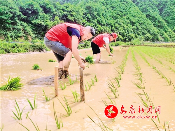 本网讯(通讯员 陈阳军)农忙时节不等人。不久前,地处秦岭腹地的宁陕县龙王镇棋盘村,有一群人,他们身穿“红马甲”抢抓好时节移栽秧苗,在水田里来回穿梭,帮助村民把一株株秧苗整齐有序地插入水田里,在蓝天白云的映衬下,田间地头呈现出一幅忙碌的夏耕画卷。