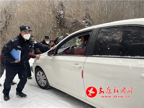 民警在巡逻途中发现一辆小型轿车右侧前轮掉进路边排水沟被困,经了解,由于该路段积雪较厚、道路较窄,加上该车驾驶员不熟悉路况,车辆未戴防滑链,一不小心便将车开进路边排水沟,导致车辆被困,所幸车上人员均未受伤。因事发路段来处于半坡,道路积雪较厚,民警立即设立警示牌,进行交通疏导,维护现场秩序,提醒过往车辆注意行车安全。