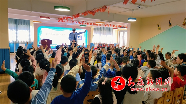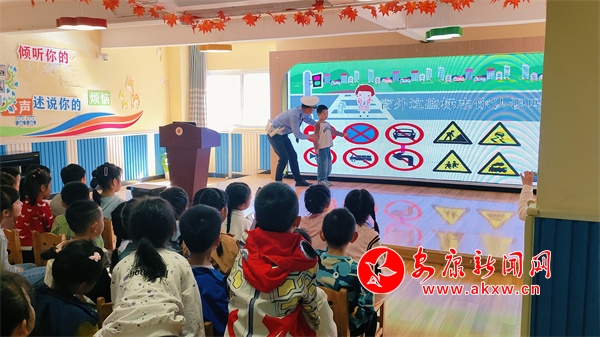 活动中,民警用生动有趣的语言为小朋友讲解了安全行走、安全过马路、安全乘车以及正确佩戴安全头盔、系好安全带、认识交通标志标识等基本的交通安全知识。同时,通过现场互动、你问我答的方式,向学生们讲解闯红灯、横穿马路、多人骑乘摩托车等不文明交通行为的危害。最后,民警现场教学交通指挥手势,加深小朋友对交通安全常识的理解与记忆,引导他们从小树立安全出行的理念,增强安全意识,自觉遵守交通法规。
