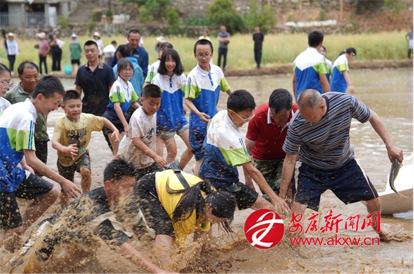 插秧比赛后紧接着开展了拔河比赛,参赛者们光着脚在泥泞的田里奋力拉扯,你来我往,互不相让,田边的观众则奋力地为自己支持的队伍加油鼓劲。稻田抓鸭捕鱼活动让现场气氛更加热烈,观众纷纷脱下鞋袜,卷起裤腿,在稻田中追逐游鱼和鸭子,欢快的笑声此起彼伏。