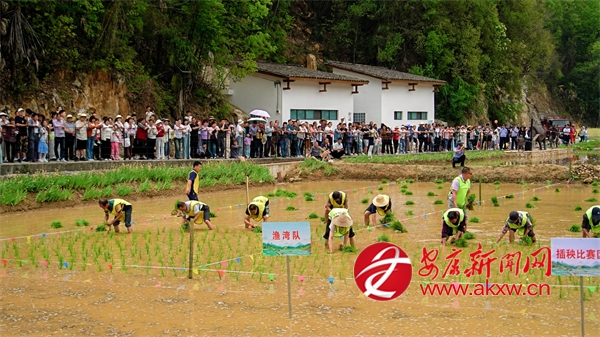 10点50分,插秧比赛正式开始,只见寨沟村、龙泉村、渔湾村、汤坪村四支队伍在水田中依次排开。 随着清脆的哨响,四支插秧队伍迅速进入状态,水田瞬间化作激烈的赛场。弯腰俯身,左手攥紧秧苗,右手分秧、插秧,一株株嫩绿的秧苗被精准插入田中,泥水飞溅间,选手们你追我赶,汗水与欢笑交织,将传统农事活动演绎成了一场精彩绝伦的视觉盛宴。