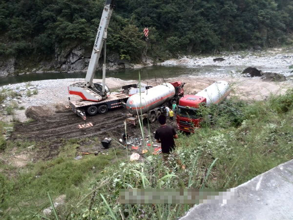 8月27日,一辆液化气重型罐车由西安驶往安康,途径210国道宁陕县江口镇内时,由于雨天路滑在一急转弯处发生意外,车翻滚入路外的河滩里,车辆受损乘员严重受伤,……
