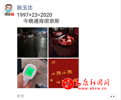 陈玉沈被分派防疫一线后,村上干部一直都在关注他的工作状况,傍晚的时候村支部书记发现他在朋友圈发了一句“1997+23=2020,今晚通宵很奈斯”的话后,大家才推断出,今天是陈玉沈23岁生日,他还在坚守岗位,通宵值守。