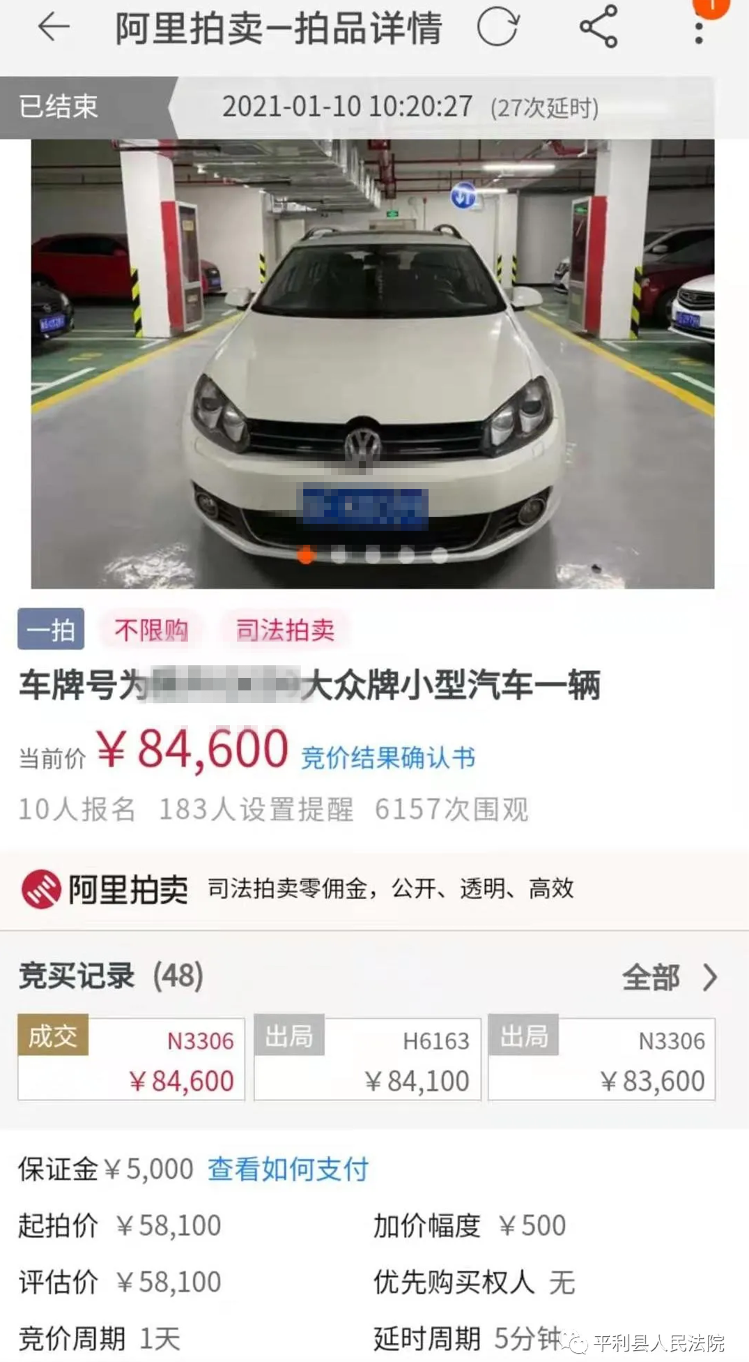 本网讯(通讯员 郑钦)成交了!1月10日上午十点二十分,平利法院通过淘宝网网络司法拍卖的一部大众牌小型汽车以高出评估价百分之四十五的价格成功拍出。