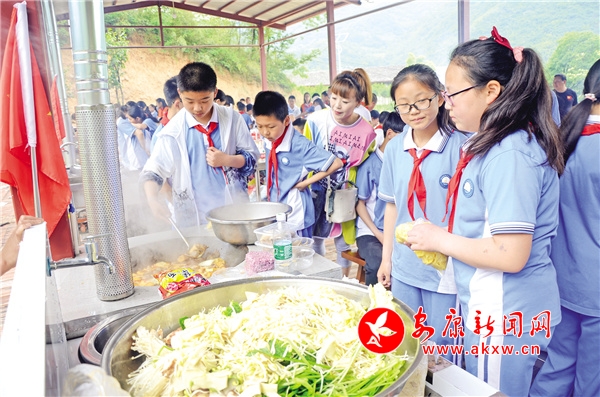 一草一木是记忆,一山一水皆含情。野营拓展课程是整个研学旅行的核心和精品,让学生们亲近自然风物,感知熟悉泥土的芬芳和厚重。课程营地集野炊、农事体验、野营体验、手工制作、森林探险于一体,设有炊烟袅袅、荷塘春秋、耕耘树艺、野蛮体魄四个活动区。200余种花卉草木,满眼芳菲,争奇斗艳,学生们参观辨识认知植物,通过栽种、为植物挂牌、临摹写生等方式发现植物的奥秘,感受大自然的无穷魅力,做植物的朋友和环保小卫士。枇杷、桃子、杏子、李子、板栗和梅子等多种果树,可满足学生们进行水果采摘体验的需求,在东篱院里了解时令蔬菜、参与蔬菜种植,体验耕种的乐趣和劳动的艰辛。在炊烟袅袅活动区,10座老式土灶,配套10个操作台、10个清洁池、10套石磨,一字整齐排开,选菜、洗菜、切菜、生火、煮饭、炒菜,一切都井井有条。学生们在寓教于乐的过程中,感受野炊的乐趣,初步掌握饭菜制作的基本步骤和相关技巧,并感受一蔬一饭的来之不易,懂得珍惜粮食和蔬菜。参与了活动的小学生唐梓涵深有感触地说:“大家尽情享受一起努力做出来的美食,吃在嘴里,乐在心头,格外美滋滋的。我们也知道了,父母每天精心为我们做好吃的,真的很不容易。”