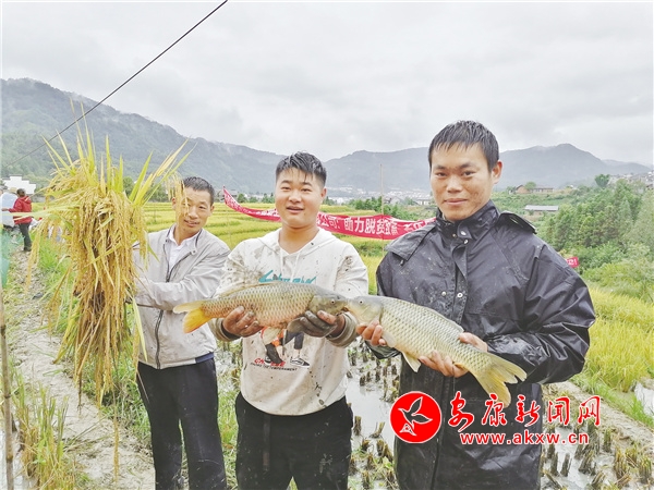 2019年开始,平利县大贵镇嘉峪寺村大力发展集体经济,当地能人王银在充分挖掘本地资源优势的基础上,成立了宝银种养殖专业合作社,依托良好的生态环境和区位优势,加之优质的山泉水,流转土地种植500亩富硒水稻。经过一年的发展,当年便收获了20万公斤稻谷,也赢得了广阔的市场。2020年为进一步增加收入,王银便萌生了养稻花鱼的想法,组织宝银种养殖农民专业合作社采取“合作社+贫困户”的模式,通过统一品种、统一种植、统一管理等方式,开启“一田两用、一水双收”的发展模式,养殖生态稻花鱼,陆续投放了20万尾鱼苗。稻因鱼而优,鱼因稻而贵。“稻田里养了鱼,就不用农药和除草剂了,鱼会吃掉稻田中的害虫、杂草、掉落的稻花,排出的粪便又能成为水稻生长的肥料。”王银说,稻田养鱼实现了“一水两用、一田多收、稻鱼双赢”。割稻时节,稻香鱼肥庆丰收,稻田里农民兄弟们忙着收割打谷、捉鱼,田埂旁搭起的临时小舞台上载歌载舞,欢声笑语四处洋溢。
