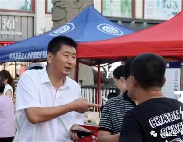 平利县新立人力资源公司经理杨付权与应聘者交谈。