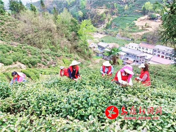 一大早,平利县天书峡乡村建设服务公司负责人张建成就组织着采茶工人,前往八仙镇鸦河流域的靛坪村、号房坪村茶园开展春茶采摘工作。三十多名采茶工身穿红马甲,腰挂茶篓,指尖翻飞,一片片嫩芽被收入篓中,春日“鲜”定的绿色收入也被收入囊中。