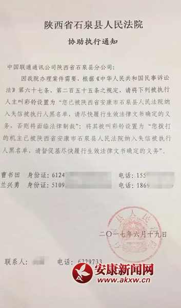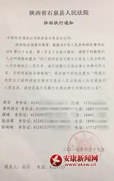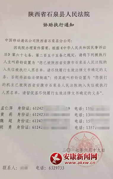 安康新闻网讯(通讯员 尚君)“您拨打的机主已被陕西省安康市石泉县人民法院纳入失信被执行人黑名单,请督促其尽快履行生效法律文书确定的义务”,这样的彩铃您从来没听过吧!今后,这样的彩铃您在生活中或许就会遇到。6月19日,石泉县人民法院由安康市中级人民法院指定为“通信限制”试点法院,分别与石泉县移动、电信、联通三大通信公司协商一致,将通过发送《协助执行通知书》的方式请三大通信公司协助执行,在全省率先对“老赖”实施通信限制。