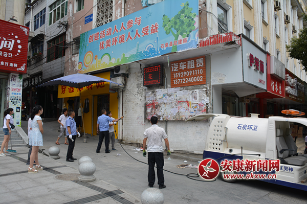 7.1前夕,县住建局、城管大队联合环卫所组织全体执法人员走上街头并出动洒水车,强力清污车对全城人行道、天桥、沿街的“牛皮癣”进行清理,规范市场及占道经营,以此拉开了“百日整治”的序幕。
