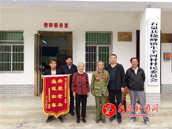 安康新闻网讯(通讯员 杨晓莉 王全军 )“感谢牛羊河村委会,感谢你们驻村工作队啊!”身着退伍军装,勋章挂满胸前的抗美援朝老兵董安国握着石泉县饶峰镇牛羊河村驻村工作队队长王全军的手连连道谢。大家还在纳闷中,绣着“关爱老兵,温暖如春”的锦旗由董安国夫人、牛羊河村村籍的王武英递到了村支书张荣全手中。