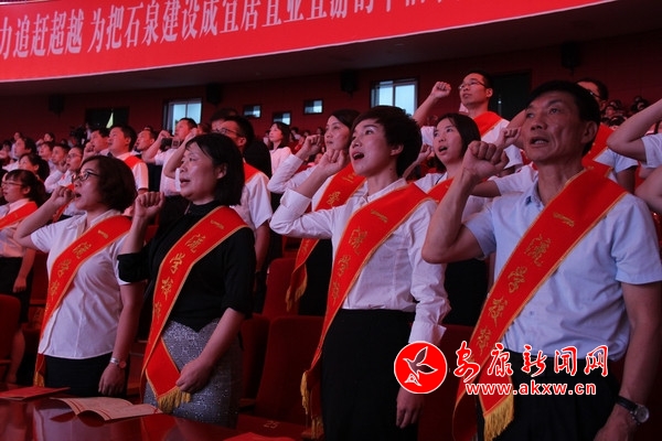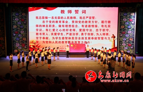 演出现场,对石泉中学等10 个“一流教育质量单位”,李超旗等10名一流学校校长,陈兴兰等30名“一流教学能手”,杨细雨等50 名“三爱标兵”进行了表彰奖励,2019年新入职的教师代表进行了宣誓,老教师重温了誓词。